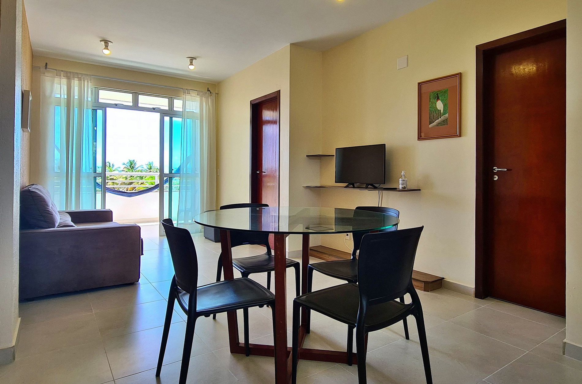 Aqui, você encontrará um espaço familiar e acolhedor ideal para quem busca tranquilidade e conforto. No apartamento acomoda-se quatro pessoas, possui uma sala ampla com sofá reclinável, cozinha americana (itens necessários para sua estadia), duas suítes climatizadas com ducha quente e uma varanda com vista para natureza dos coqueirais em direção ao mar tendo uma ótima ventilação natural. Oferecemos roupa de cama e toalhas, secador, wifi, TV e possui estacionamento privativo.